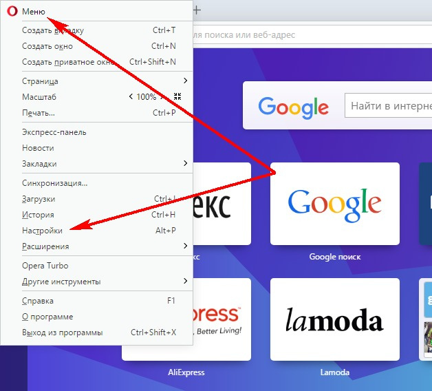 1. Запустите Opera и нажмите на пункт "Меню" на верхней панели браузера. Затем выберите "Настройки":