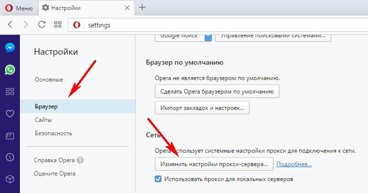 2. В настройках открываем "Браузер" и находим поле “Сеть” и нажимаем на кнопку “Изменить настройки прокси-сервера”, которая находится ниже.