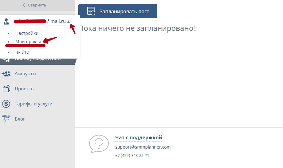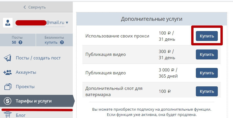 Открываем раздел "Тарифы и услуги" >> "Дополнительные услуги" >> "Использование своих прокси" >> "Купить" (активируем эту возможность).