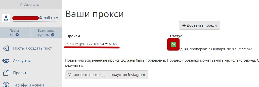 Ожидаем несколько секунд и обновляем страницу, если всё настроили верно статус прокси будет "OK".