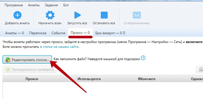 Теперь мы можем добавить прокси в программу, для этого на главной странице выбираем вкладку Прокси > Редактировать список.