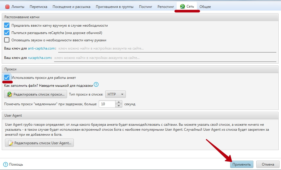 Далее Сеть, включаем использование прокси, ставим галочку и нажимаем Применить.