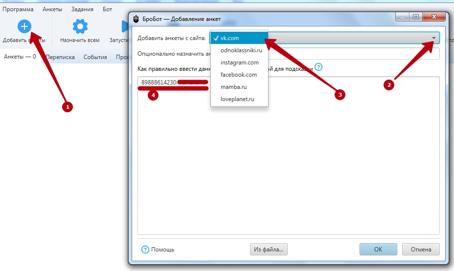 На главной странице программы выбираем Добавить анкеты > Добавить анкеты с сайта (ВК), указываем логин и пароль от аккаунта в формате логин:пароль и нажимаем ОК.