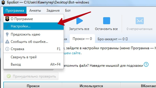 Запускаем программу и включаем использование прокси для анкет, заходим: Программа > Настройки.