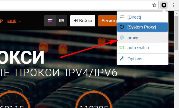 Для отключения прокси, опять же, нажимаем левой кнопкой мыши на иконке расширения и выбираем пункт "Direct".